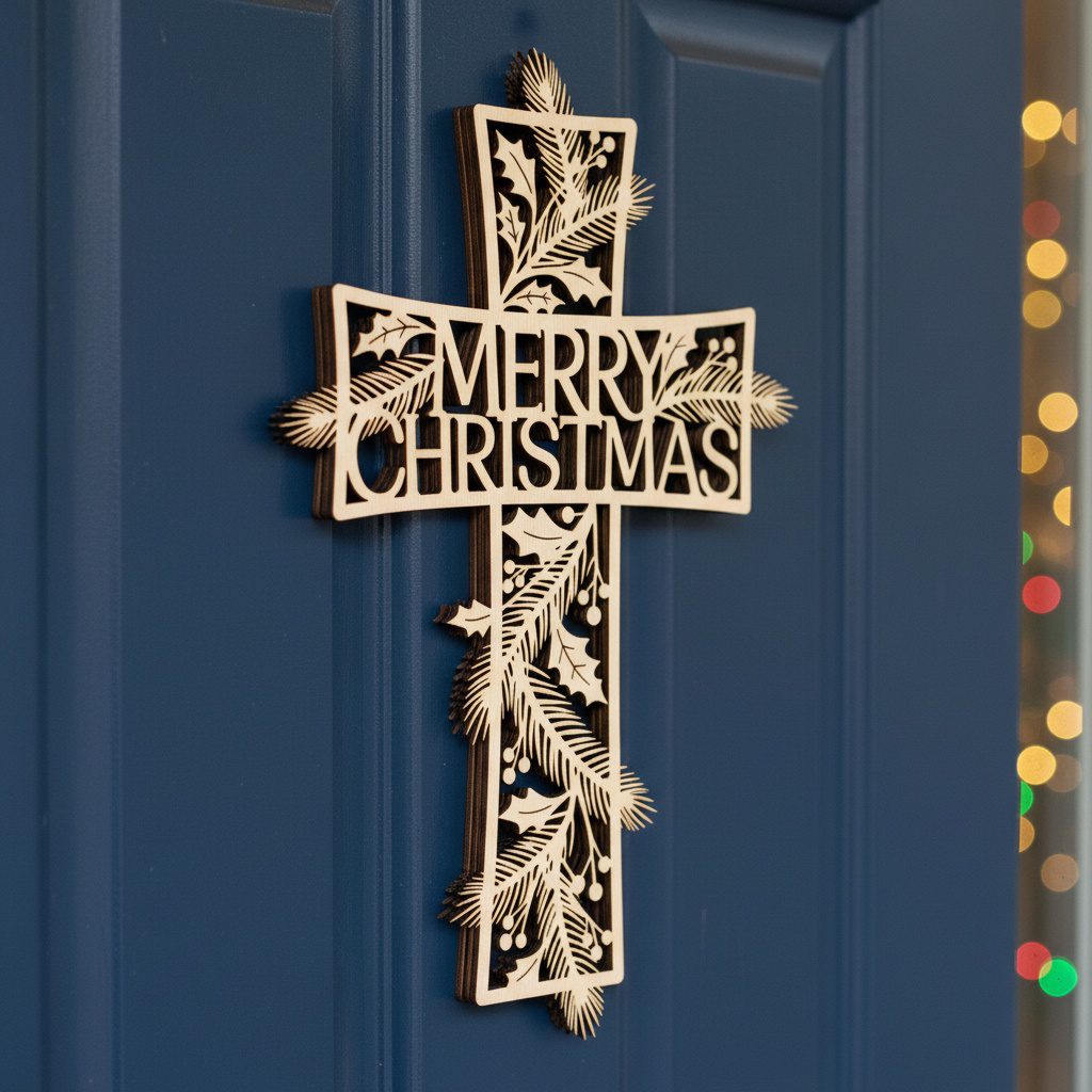 Merry Christmas Cross Sign, Religious Door Hanger, Christian Holiday Decor