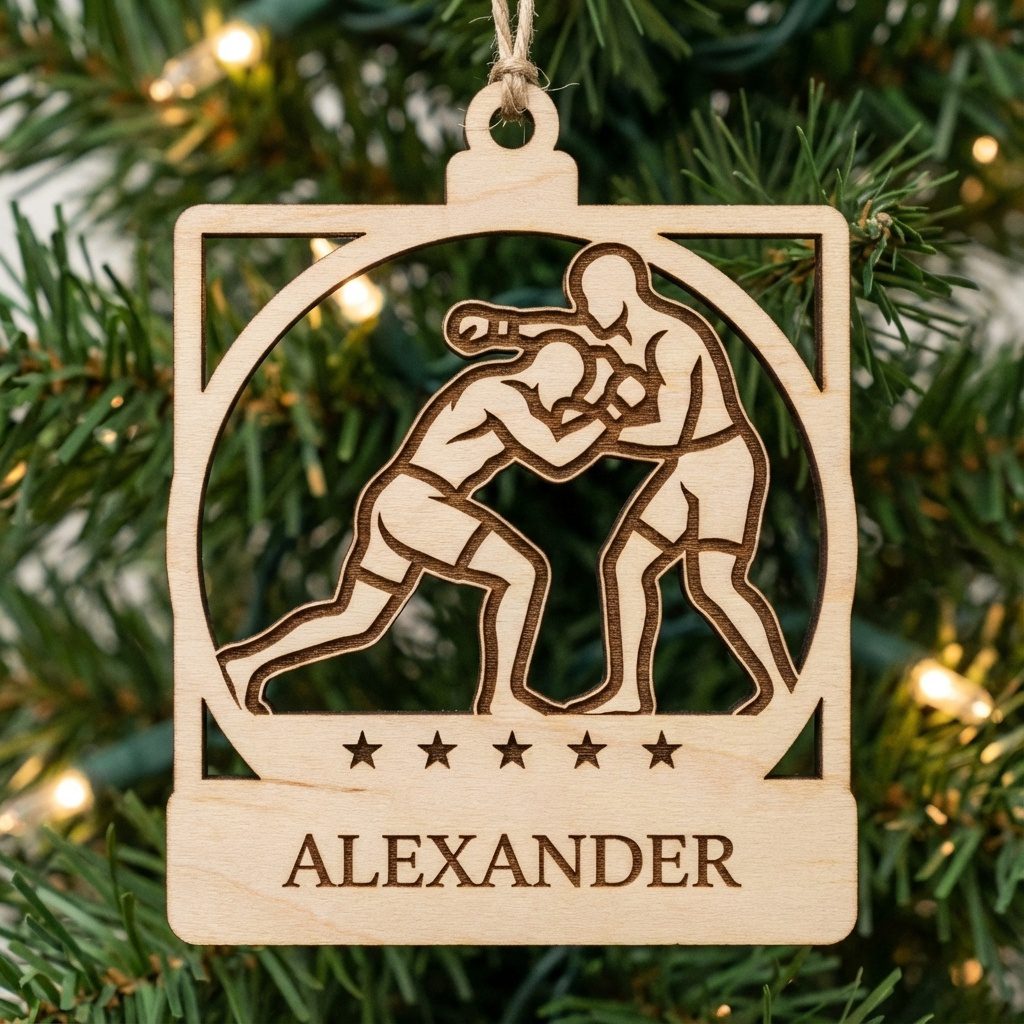 Elevate your gift with custom names, featuring a takedown clinch emblem. Personalize each piece with the fighter’s name, turning a simple ornament into an unforgettable keepsake that showcases skill and spirit.