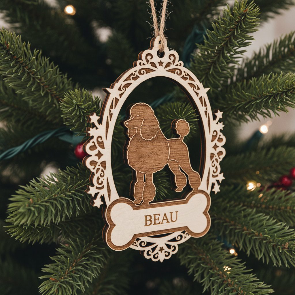 Add a playful twist to your holiday décor with this charming Poodle Ornament. Crafted for laser artisans, it features a delightful dog silhouette perfect for holiday gifts. Personalize with your pet’s name, turning a simple ornament into a treasured keepsake.